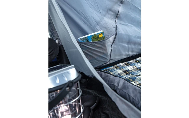 Aufblasbares, komfortables Familienzelt aus hochwertigem Ripstop-Polyester mit viel Platz für bis zu 4 Personen. Schneller und unkomplizierter Aufbau Dank aufblasbarem Gestänge. Sechs Fenster (je ½ Moskitogaze, ½ Klarsichtfolie) sorgen für die perfekte Wohlfühlatmosphäre mit ausreichend Lichtzufuhr und Ventilation. Der fest eingenähte Zeltboden bietet zusätzlichen Komfort und schützt vor Schmutz, Nässe wie auch ungebetenen Tieren. Zudem überzeugt das Zelt mit zwei einhängbaren Schlafkabinen inklusive Moskitogaze-Tür, welche bei Bedarf zur Vergrößerung des Wohnraums entfernt werden können. Der geräumige Aufenthaltsraum lädt zum Verweilen ein und bietet aureichend Platz für Ihr Mobiliar.